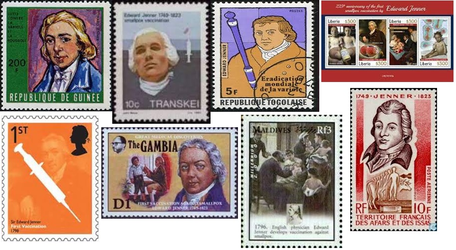A continuació els hi mostro vuit segells dedicats a Edward Jenner, el descobridor de la vacuna de la verola, emesos per diferents països, que honoraven amb el segell la gran aportació feta pel metge anglès.
