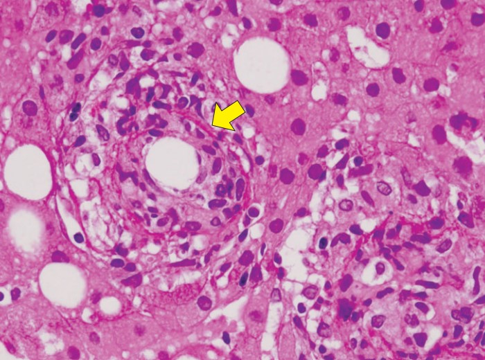 Fig.5 Granuloma tipus donut, constituït per un agregat de macròfags i limfòcits que envolten un vacúol clar central i presència d’un anell fi de fibrina (fletxa), que tradueix necrosi fibrinoide de la paret sinusoïdal, típica de la febre Q. (Presa de l’article Granulomas hepáticos. Miquel Bruguera i Rosa Miquel. Gastroent. continuada, 2009)