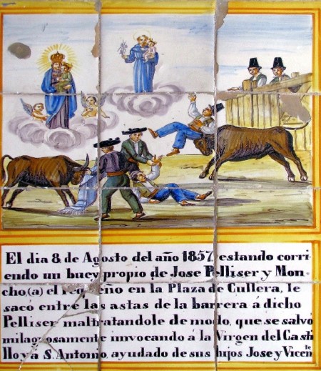 En un dels exvots (Fig.2), la persona agraïda és un tal Josep Pellicer que estava torejant a la plaça de braus de Cullera i va quedar atrapat entre les dues banyes d’un brau, de manera que no li podia fer cap mal, fora de l’espant que devia tenir. Dos fills van saltar a la plaça per ajudar el pare, col·laborant amb la Verge en salvar la pell d’un pare imprudent.
