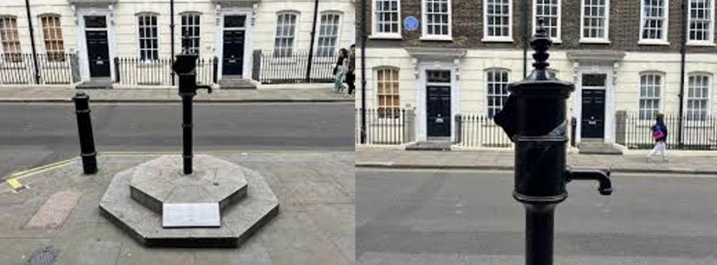 Al carrer Broadwick St. (abans es deia Broad St.) hi havia la bomba d’aigua que John Snow va fer tancar, perquè la seva investigació el duia a considerar que era la font de l’epidèmia. En el lloc on hi havia la font s’hi ha instal·lat una còpia d’una font d’ús públic d’aigua de boca (Fig.3).
