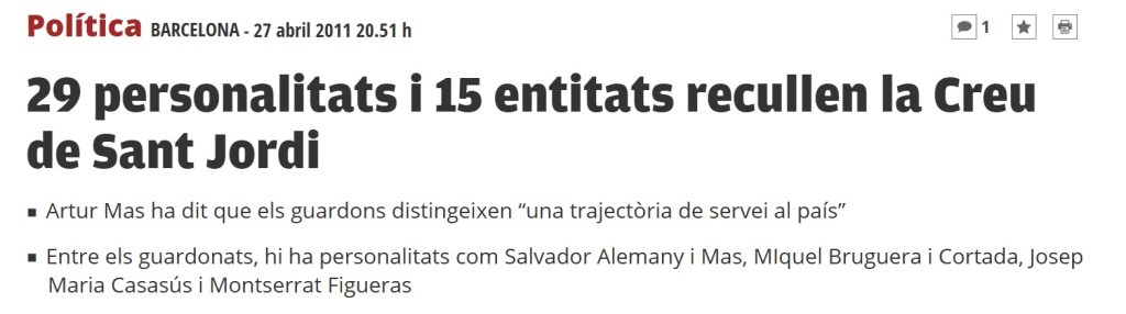 He trigat un temps a decidir-me a escriure aquesta entrada del blog perquè em feia por donar una mostra d’exhibicionisme excessiu. Però també he pensat que una Creu de Sant Jordi és un premi massa gran per tenir-lo amagat, i he acabat escrivint aquestes ratlles.